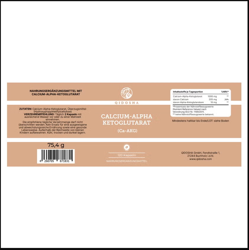 WHAT EXACTLY IS CALCIUM ALPHA KETOGLUTARATE (AKG)? AKG is the nitrogen-free portion of the amino acid glutamine and a natural intermediate in human metabolism. AKG is involved in the citric acid cycle in the mitochondria and is therefore part of cellular energy production. AKG also plays a role in nitrogen and ammonia homeostasis and in amino acid biosynthesis, i.e., the formation of proteins. The proteinogenic amino acid L-glutamine is formed from AKG and ammonia. L-glutamine is consumed in increased amounts, especially during exercise, but also during periods of stress and infections. Alpha-ketoglutarate, alone or in combination with the amino acid arginine, is particularly popular among athletes and bodybuilders. Organs that are particularly rich in AKG include: the stomach/intestines, liver, muscles (including the heart muscle), brain, and adipose tissue. AKG levels decrease with age. The innovative blend of calcium and alpha-ketoglutarate ensures a longer residence time of alpha-ketoglutarate in the digestive tract, thus increasing its bioavailability in the human body.KEY FACTS AT A GLANCE Contents (grams per unit) 75.4 Contents (capsules or ml per unit) 120 Ingredients: Calcium alpha-ketoglutarate, coating agent (hydroxypropylmethylcellulose) Dosage (mg/capsule) 500 Daily Intake (capsules or drops) 2 Dosage Form: Hard capsule Vegan/Vegetarian: Vegan Organic Certification: No Made in (Country): Germany Storage per package (days) 60 Packaging (glass/pouch bag): Glass Category: Vitamins & Minerals EAN: 4260705871831 SKU: QI0130